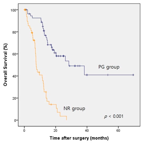 All statistical analyses were conducted using the SPSS® software (version 18.0; IBM, Chicago, IL, USA). Patients in both the PG and NR groups were matched using propensity score matching (PSM) to reduce the possibility of selection bias for comparisons. The logistic regression model was used to calculate the propensity scores for each patient based on the baseline characteristics including age, sex, American Society of Anesthesiologists Physical Status (ASA-PS) score, histologic differentiation, and reasons for incurability. Patients in the PG and NR groups were matched at a 1:1 ratio using the nearest propensity scores on the logit scale. Either Pearson’s chi-square test or Fisher’s exact test was used to compare categorical variables, whereas Student’s t-test or the Mann–Whitney U test was applied to evaluate the differences in continuous variables between the groups. The Kaplan–Meier method was used to estimate the overall survival in each group, and the difference was assessed using the log-rank test. The Cox regression model was used for conducting univariate and multivariate analyses to identify independent prognostic factors for overall survival. Two-sided p-values were calculated for all the tests, and a p-value < 0.05 was considered to be statistically significant.