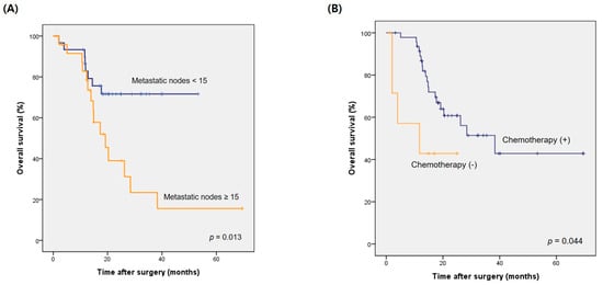 Difference in overall survival in patients who underwent palliative resection: (A) according to the number of metastatic lymph nodes (p = 0.013); (B) according to the administration of postoperative chemotherapy (p = 0.044, log-rank test).