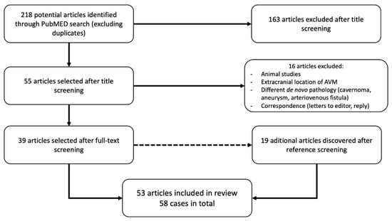 As of June 2020, our search yielded 218 results on PubMed. After careful consideration of titles and abstracts, we have eliminated 163 articles which were not relevant to the subject at hand, followed by the exclusion of an additional 16 that were either in vitro or animal studies, other systematic reviews, case reports detailing other vascular pathologies such as arteriovenous fistulas, aneurysms, cavernomas, or AVMs outside of the cranial cavity. Among these, two articles which represented correspondence regarding the same article, as well as a letter to the editor concerning another article, were eliminated. Moreover, 19 further articles were identified subsequent to the scrupulous reference review of the previously retrieved studies. As such, we have obtained a total of 58 cases of presumed de novo AVMs from 53 articles matching our inclusion criteria. We then divided the patients according to pathological subgroup of the presumed predisposing disease, and in alphabetical order of the first author, as seen in Table 1. The flow-chart for our literature gathering is summarized in Figure 1.