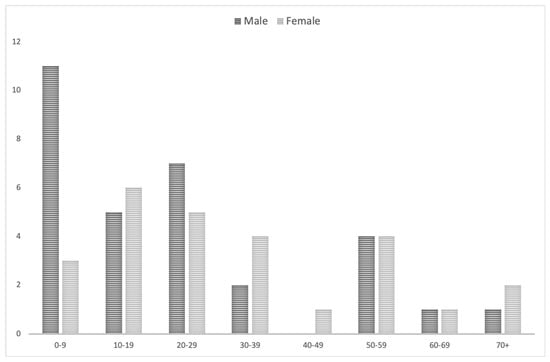 Distribution of patients with de novo arteriovenous malformations according to gender and decade of age at the time of diagnosis. Abscissa: age group (decade of life) for male (dark grey) and female (light grey) patients. Ordinate: number of patients included.