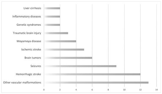 We grouped the patients according to the major underlying pathology allegedly associated with the development of de novo AVMs. We considered ten major categories, in descending order of frequency: preexisting cerebrovascular malformations (including other AVMs, cavernomas and aneurysms)—13 patients (22.41%); hemorrhagic stroke—11 cases (20.69%); epileptic seizures—nine individuals (15.52%); brain tumors—six patients (10.34%); ischemic stroke—five patients (8.62%); Moyamoya disease—four cases (6.9%); traumatic brain injury—three patients (5.17%); and genetic syndromes, inflammatory diseases, and liver cirrhosis, each with two individuals (3.45%). This is also illustrated in Figure 3.