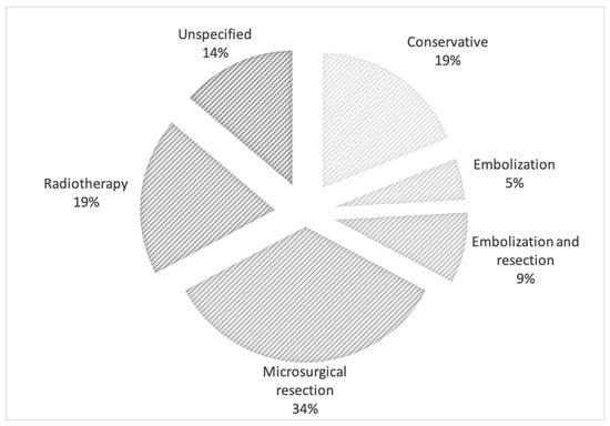 Once diagnosed, the majority of de novo AVMs were treated via microsurgical resection (20 out of 58, or 34.48%), followed by radiosurgery and conservative management for 11 patients (18.97%) each (Figure 4). Endovascular embolization combined with subsequent resection was the choice method of therapy for five patients (8.62%), whereas only three (5.17%) underwent embolization alone. For the other eight cases (13.79%), therapy was not mentioned within their respective articles.