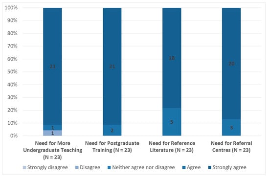 Responses to the questions relating to the needs for teaching, training, reference literature, and referral centres are presented in Figure 5. Given the very high levels of consistency in responses across these responses, there is little need to discuss them in detail. Nonetheless, it is important to note that 21 respondents (91%) strongly agreed that there should be more teaching about ME/CFS in undergraduate medical curricula, while 21 respondents (91%) strongly agreed that postgraduate training about ME/CFS should be available for doctors and other healthcare professionals. For the latter question, the remaining survey respondents agreed with the statement. In addition, all respondents either strongly agreed or agreed that there is a need for succinct reference literature on ME/CFS for doctors and other healthcare professionals in primary care and that there is a need to ensure the existence of adequate secondary and tertiary referral centres for ME/CFS, from which primary care doctors could seek help and advice when necessary.