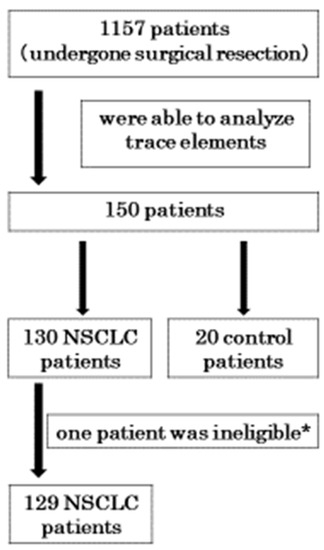 Figure 1 shows the patients who participated in this study. Of the 1157 patients who underwent surgical resection of lung tissue at our hospital, 150 whose trace elements could be analyzed participated in the study. They included 130 NSCLC patients and 20 control patients. Of the 130 NSCLC patients, one was unable to be followed after surgical resection and was excluded from the study.