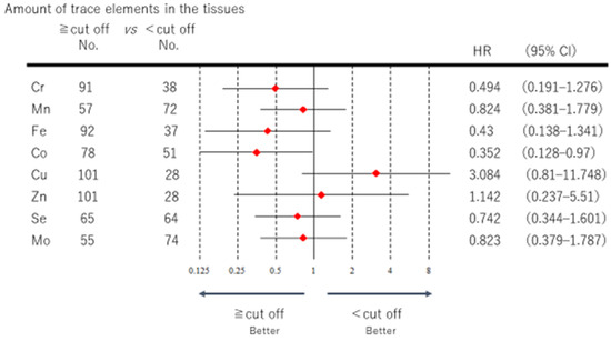 Figure 5 shows a forest plot of OS related to each trace element. Cr was the only element that showed a significant difference. The low Cr group showed a significantly poorer OS than the high Cr group (HR: 0.477, 95% CI = 0.128–0.97), the high trace element group having better OS. The HR (95% CI) of each trace element was as follows: Mn 0.698 (0.386–1.263), Fe 0.697 (0.31–1.74), Co 0.481 (0.189–1.222), Cu 0.748 (0.321–1.74), Zn 0.775 (0.33–1.821), Se 0.752 (0.415–1.361), and Mo 0.993 (0.54–1.826). No significant difference was observed for any other elements, but OS tended to be higher in the high trace element group.