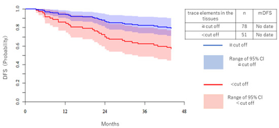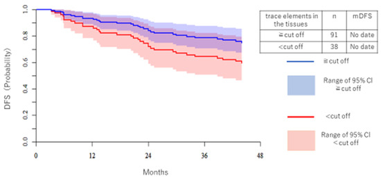 Figure 3 shows DFS and the Kaplan–Meier curve (KM) of Cr. No significant difference was observed, but DFS tended to be better in the high trace element group. Median DFS (mDFS) was immature.