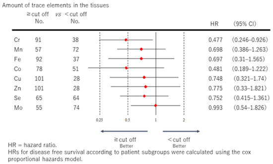 Figure 2 shows a forest plot of DFS for each of the trace elements. Co was the only element that showed a significant difference. The low Co group showed a significantly poorer DFS than the high Co group the hazard ratio (HR) of Co was 0.352 and the 95% confidence interval (95% CI) was 0.128–0.97), the high trace element group having better DFS. The HR (95% CI) of each trace element was as follows: Cr 0.494 (0.191–1.276), Mn 0.824 (0.381–1.779), Fe 0.43 (0.138–1.779), Se 0.742 (0.344–1.601), and Mo 0.823 (0.379–1.787). No significant difference was observed for Cr, Mn, Fe, Se, or Mo, but DFS tended to be better in the high trace element group. The HR of Cu was 3.084, with a 95% CI of 0.81–11.748, and the HR of Zn was 1.142, with a 95% CI of 0.237–5.51. No significant difference was observed for Cu or Zn, but DFS tended to be better in the low trace element group.