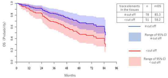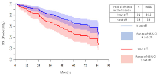 Figure 6 shows the DFS and KM of Cr. The high trace element group had better OS. Median OS (mOS) of the high Cr group was 84.5 months, and for the low Cr group it was 58 months.