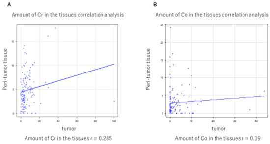 The correlation between the trace element concentrations in the tumor tissue and the concentrations in the nontumor tissue (normal lung tissue) in the obtained sample was examined by the Spearman’s rank correlation coefficient. In one patient, Cr was significantly different from the average value, so this was excluded from the analysis. Figure 8A shows that the correlation coefficient of Cr was 0.285. Figure 8B shows that the correlation coefficient of Co was 0.19. There was no correlation in Co and Cr concentration between tumor tissue and peritumoral normal tissue in the identical specimens.