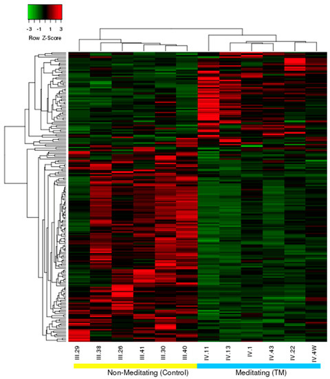 Microarray data were subjected to statistical analysis using R BioConductor (lumi and BeadArray) packages that include methods correcting for Type 1 and Type 2 errors [40]. Differential expression for each individual gene was considered acceptable if it met comparatively strict criteria, i.e., ratio of TM and control group gene-expression values (normalized by the quantile method) ≥2.0 and p-value for differential expression ≤0.05. A heat map with hierarchical clustering was created from data on the differentially expressed genes using the average linkage method and the Pearson distance metric to show how data aggregated. This analysis was performed in R version 2.11.1 with the gplots package using hclust and heapmap.2 functions [41]. Networks with molecular paths plausibly affected by practice of the TM program were identified using Ingenuity® Pathway Analysis (IPA®) software [42].