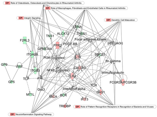 Network 1 (p-score 37): Cell-to-cell signaling and interaction, hematologic system development and function, and inflammatory response. Nodes without color denote non-significant genes, solid lines denote direct connections, and dotted lines denote indirect connections. Genes color-coded in red are upregulated and those in green are downregulated in the TM group. CP indicates canonical pathways.