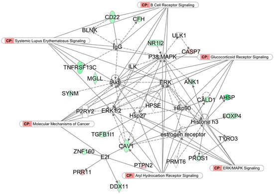 Network 2 (p-score 28): Cellular morphology, cell-to-cell signaling and interaction, and hematopoiesis. Nodes without color denote non-significant genes, solid lines denote direct connections, and dotted lines denote indirect connections. Genes color-coded in red are upregulated and those in green are downregulated in the TM group. CP indicates canonical pathways.