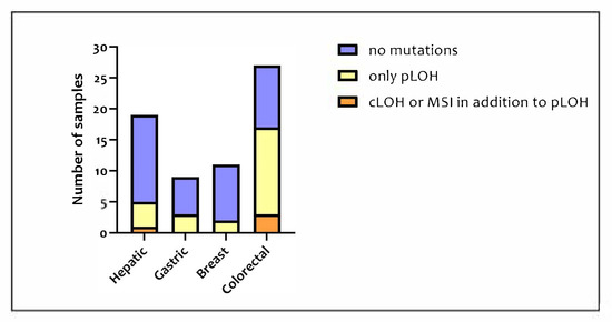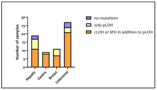 The 38 InDel polymorphisms of the InDelPlex INDEL Polymorphism Detection Kit were analyzed in each sample for a total of 5016 loci analyzed. Specifically, 17 hepatic, nine gastric, 11 breast, and 24 colorectal samples, which overall represent 92.4% of the samples, reported mutations altering the tumor-sample genotype in comparison to their corresponding healthy tissue. Among the mutated samples, the ones with LOH or MSI in addition to pLOH numbered 47. In Figure 3, the proportion of tumor samples presenting no mutations, only pLOH, and pLOH with LOH and MSI is shown for each type of tissue included in this study.