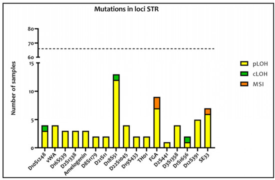 Graphical representation of the mutation distribution among the different STR loci. The polymorphisms mutated in the majority of samples were D18S51 (12 partial loss of heterozygosity (pLOH) and one complete loss of heterozygosity (cLOH)), FGA (seven pLOH and two microsatellite instability (MSI)), and S33 (six pLOH and one MSI). The dotted line indicates the total number of samples which were analyzed, so the difference between the dotted line and the height of each column represents the number of samples not mutated for that particular polymorphism.