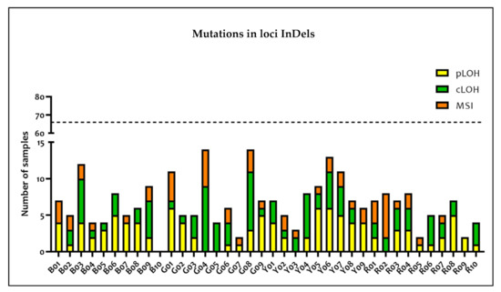 In particular, the most altered loci were G04 (nine cLOH and five MSI), G08 (three pLOH, eight cLOH, and three MSI), Y06 (six pLOH, five cLOH, and two MSI), and B03 (four pLOH, six cLOH, and two MSI). LOH and MSI occurred 200 times (~8%) and 52 times (~2%), respectively. Moreover, at least one LOH was detected in each polymorphism except for B10 which did not show any alteration both in terms of LOH and MSI. Conversely, at least one MSI was observed in approximately 66% of the polymorphisms.