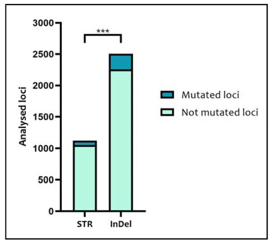 Comparison among the total number of mutated and non-mutated loci of STRs and InDels. The comparison was performed with the Chi-Square test; “***” = p < 0.001.