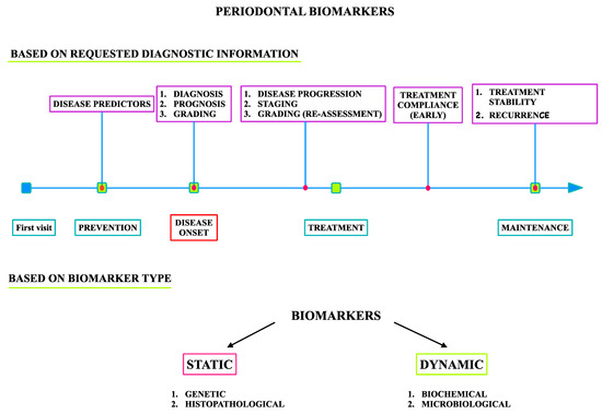 Biomarkers in periodontology can be classified based on the requested diagnostic information and based on the biological type (Figure 2) appropriate for the clinical strategy in order to provide diagnostic information specific to each clinical phase.