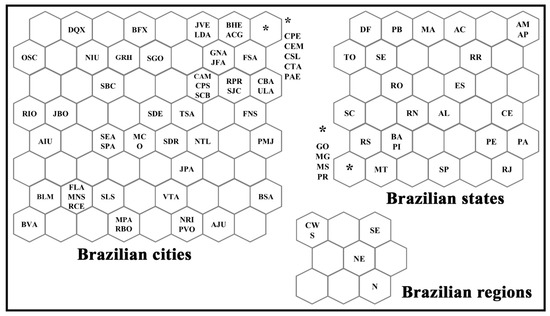Topological maps for the distribution of Brazilian cities, states, and regions according to the winning neuron. See abbreviations in Table 1. Where: * represents the clusters of cities and states in each network grouped in the same winning neuron.