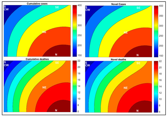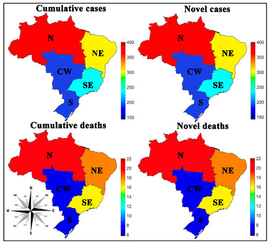 The results show that the North (N) and Northeast (NE) regions have the highest rates of novel and accumulated cases and deaths by COVID-19 per 100,000 inhabitants, which are followed by the Southeast region (SE), the most populous region in the country, and then the South (S) and Central-West (CW) regions, which had the lowest rates. Reports indicate that Brazil’s highest number of COVID-19 cases is in the Southeast region, although the SOM network has shown that the highest rates per 100,000 inhabitants are in the North and Northeast regions of the country, see Figure 2 and Figure 3.