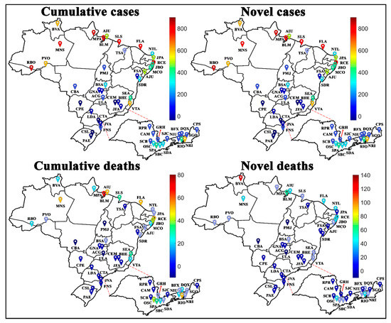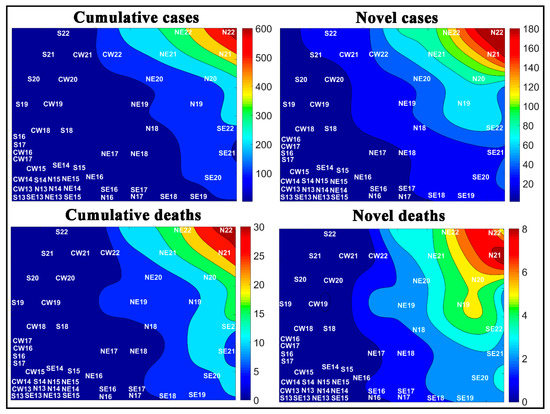 Another approach for analyzing the novel and accumulated case and death rates for COVID-19 was to assess the temporal aspect of the COVID-19. Figure 10 shows the numbers of novel and cumulative cases and deaths by COVID-19 in Brazilian cities in each epidemiological week. According to the weight maps, the largest number of cases per 100,000 inhabitants. For a better view of each window in Figure 10, the reader can consult Figures S1–S4 of the Supplementary Materials.
