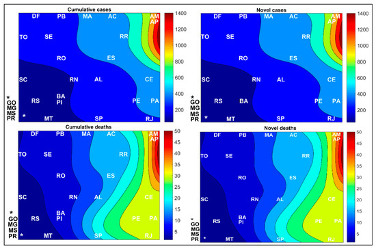 The second dataset for the Brazilian states represents the sum of the number of cases and deaths accumulated since the first COVID-19 record in Brazil until week 22. The numbers of novel cases and deaths are equivalent to the sum of cases registered between weeks 13 and 22 for all states.