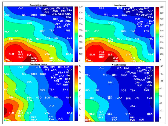 Figure 8 shows the variation in COVID-19 case rates for cities in Brazil; in general, the cities located in the South and Central-West regions of Brazil have the lowest reported rates. Meanwhile, the cities most affected by the SARS-CoV-2, with the highest numbers of novel and accumulated cases were the cities located in the North and Northeast regions of Brazil, with emphasis on Belém (BLM), Macapá (MPA), Manaus (MNS), Rio Branco (RBO), Fortaleza (FLA), Recife (RCE), and São Luís (SLS). Belém (BLM) had the highest number of accumulated deaths, while Boa Vista (BVA) had the highest number of novel deaths recorded per 100,000 inhabitants. For a better representation, the values collected after the SOM analysis for Brazilian regions were transposed through the color scale to the Brazilian cartographic map of each variable. The original SOM outputs of the variables weight maps are shown in Figure 9.