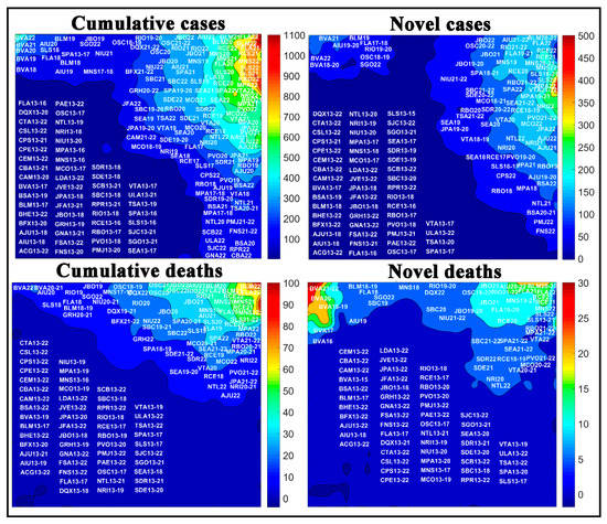 Figure 10 represents the number of novel and accumulated cases and deaths of COVID-19 for the most populous cities of the country for each epidemiological week. The highest rates per 100,000 inhabitants of accumulated cases and deaths are in weeks 22 and 21 for the cities of Belém (BLM22 and BLM21), Manaus (MNS22 and MNS21), Fortaleza (FLA22 and FLA22), São Luís (SLS22 and SLS21), and Recife (RCE22 and RCE21), located in the upper right side of the maps.