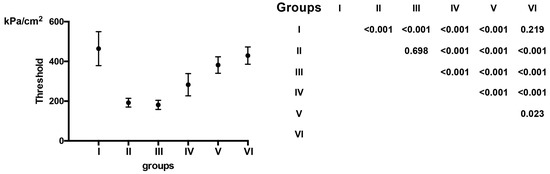 Pain threshold values in patients with IBP on the affected side were 192.01 ± 22 kPa/cm2 in group II, 181.34 ± 23.32 kPa/cm2 in group III, 282.93 ± 55.98 kPa/cm2 in group IV, 382.00 ± 41.57 kPa/cm2 in group V, whereas it was 429.44 ± 43.73 kPa/cm2 in group VI. Pain threshold values in the RAR-affected side in the group of HS and patients with IBP, and post hoc p values among the groups revealed by the one–way ANOVA are presented in Figure 1.