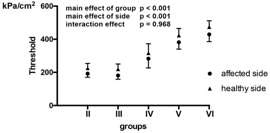 Pain threshold values among patients with Bell’s palsy regarding the affected side. Pain threshold levels of the affected side (black dots) and the healthy side (black triangles) are presented as averages ± standard deviation (whiskers). Pain threshold was assessed by two-way ANOVA (factors: group—II, III, IV, V, VI; side—affected/healthy side). There was no interaction effect (p = 0.968), but a significant effect of group (p < 0.001) and side (p < 0.001).