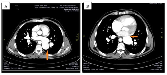 Thoracic CAT scan: (A)—a vertical collecting canal located in the left side of the mediastinum that opens into the left brachiocephalic vein. Arrow shows the presence of a vertical collecting canal.; (B)—not noted connection (opening) between the collecting canal and the left atrium. Arrow shows the relation of a vertical collecting canal with left atrium.