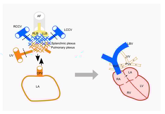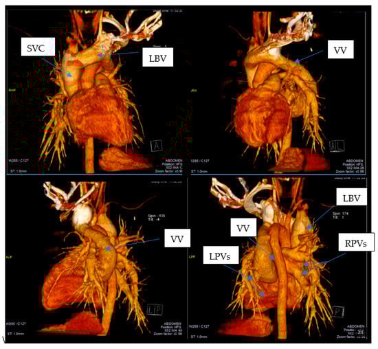 All four pulmonary veins are ending into a collecting canal that opens into the left brachiocephalic vein that drains into the superior vena cava. SVC—superior vena cava; LBV—left brachiocephalic vein; VV—vertical vein; LPVs—left pulmonary veins; RPVs—right pulmonary veins. Arrows shows the great vessels related to the heart.