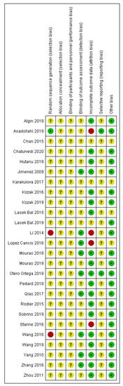 We evaluated the risk of bias of the selected articles using the Cochrane risk of bias tool [17]. We rated the studies as low, high, or unclear risk in each of the seven domains examined: random sequence generation, allocation concealment, blinding of participants and personnel, blinding of the outcome, incomplete outcome data, selective reporting, and other sources of bias. Studies with dropouts >10% and without intention-to-treat analysis were evaluated as high risk of bias in the “incomplete outcome data” section.