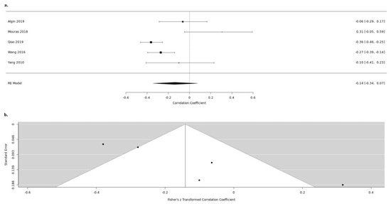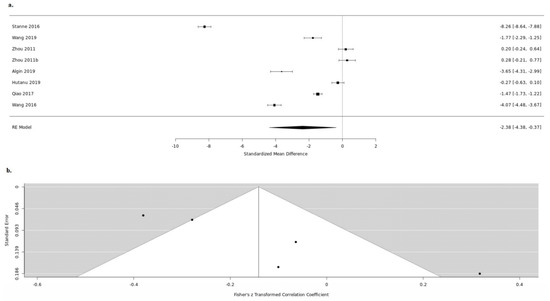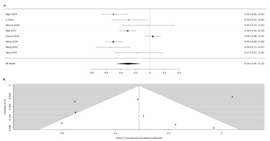 Twenty-five studies reported both the serum BDNF levels and the NIHSS during the acute stroke phase. Thirteen studies, despite measuring BDNF and scoring NIHSS, do not examine the in-between correlation [20,21,22,24,25,26,27,33,34,35,39,40,41]. Amongst the rest, nine were further meta-analyzed [14,15,23,28,32,36,37,42,43]. Due to high heterogeneity between the studies (tau2 = 0.0701, H = 3.06 (2.32; 4.05), I2 = 89.3% (81.4%; 93.9%)), we used a random-effects model. In the acute stroke phase, BDNF levels in serum were negatively correlated with NIHSS, which reached statistical significance (random-effects model COR: −0.3013, 95%CI: (−0.4725; −0.1082), z = −3.01, p = 0.0026) (Figure 3). For the detection of publication bias, we performed Egger’s regression test and the visual inspection of the funnel plot. As we detected an asymmetry in the funnel plot (t = −0.9399, df = 6, p = 0.3836), we additionally performed the rank correlation test for funnel plot asymmetry. The asymmetry detected was not statistically significant; thus, we concluded that the possibility of the publication bias to affect our results is low (Kendall’s tau = 0.2143, p = 0.5484) (Figure 3).