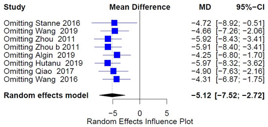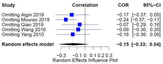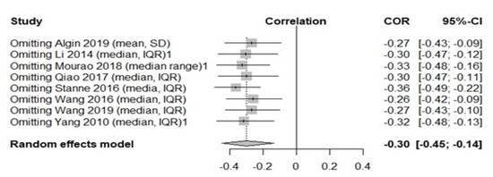 We further conducted a sensitivity analysis to assess the effects of each study to our findings. We conclude that our result is robust and is not influenced by a specific study (95%CI: −0.3011 (−0.4487; −0.1374), p = 0.0004, t2 = 0.0473, I2 = 89.3%) (Figure 4).
