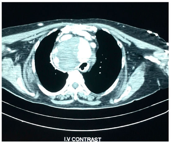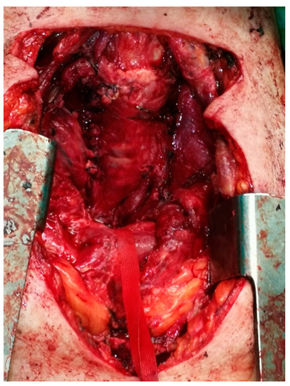 - Sahsamanis, G.; Chouliaras, E.; Katis, K.; Samaras, S.; Daliakopoulos, S.; Dimitrakopoulos, G. Patient-tailored management of an asymptomatic massive substernal goiter presenting as brachiocephalic vein occlusion. Report of a case and review of sternotomy indications. Int. J. Surg. Case Rep. 2017, 31, 35–38. [Google Scholar] [CrossRef] [PubMed]
