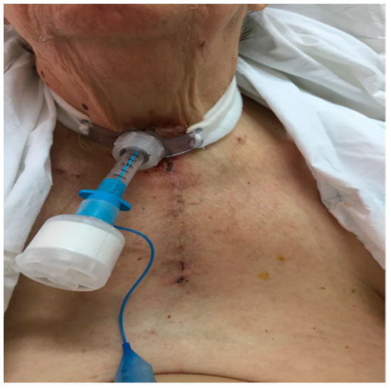 Thirty-eighth postoperative day (POD 38), just before the removal of the tracheostomy tube.