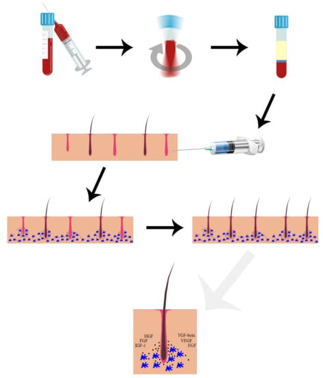 - Li, Z.J.; Choi, H.-I.; Choi, D.-K.; Sohn, K.-C.; Im, M.; Seo, Y.-J.; Lee, Y.-H.; Lee, J.-H. Autologous Platelet-Rich Plasma: A Potential Therapeutic Tool for Promoting Hair Growth. Dermatol. Surg. 2012, 38, 1040–1046. [Google Scholar] [CrossRef] [PubMed]