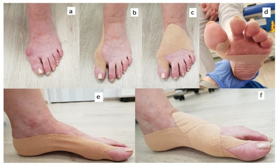 Figure 2d). Particular attention was paid so that this tape did not go past the lines of the MTP1 and MTP5 joints, which could cause adduction and pinching of the toes. The tails (the end parts of the tape), however, were attached without stretching on the dorsal surface of the foot and obliquely towards the tarsal bones (