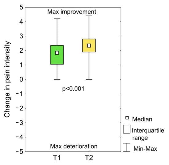 Figure 1e) their subjective feelings regarding changes in pain symptoms. Placing a mark between 0 and −5 meant deterioration while a mark between 0 and +5 meant improvement. The results are presented in the form of numbers in the range from −5 to +5.