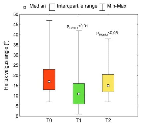 p T0 vs. T1 < 0.01). The reduction in the HV angle affected all of the tested feet. The median (Me) and first (Q1) and third (Q3) quartile of this parameter at the T0 examination were Me: 17.0°; Q1: 13.5°; Q3: 21.5° and at the T1 examination Me: 10.5°; Q1: 6.0°; Q3: 14.5°. Taping for a month (T2) had a significant effect on the reduction of the HV angle compared with pre-taping (