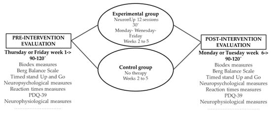 The evaluation prior to the intervention will be carried out in a single session on the Thursday or Friday before the start of the intervention and the subsequent one, on Monday or Tuesday after the end of the intervention. Necessary breaks can be taken to avoid patient fatigue (Figure 2).