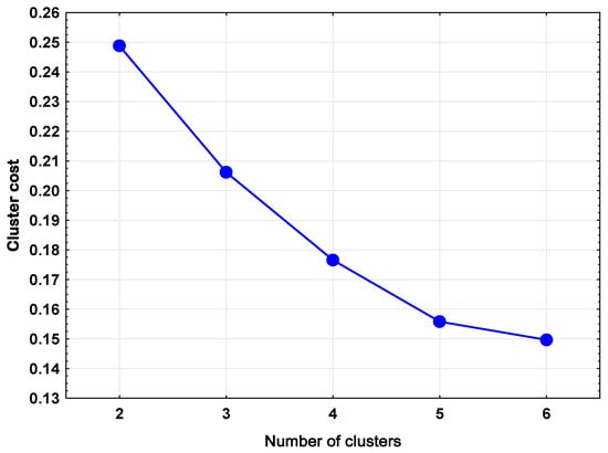 - Determination of the range of numbers of clusters for the k-means clustering algorithm: In this study, the number was set from k = 2 to n, where n ≤ 10;