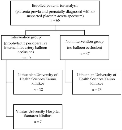 The study involved retrospective analysis of cases from two tertiary care level university hospitals in Lithuania. We collected clinical data of 66 patients with placenta previa who were prenatally diagnosed with or suspected of having PAS, based on ultrasound or magnetic resonance imaging data from electronic medical record databases and medical reports at two tertiary university obstetrics units (Lithuanian University of Health Sciences Kauno klinikos and Vilnius Univeristy Hospital Santaros klinikos), which are referral centers for high-risk obstetric patients in Lithuania. The keywords used for searching electronic medical record databases were placenta accreta, placenta increta, placenta percreta, and placenta previa. From January 2016, patients with prenatal suspicion of PAS underwent prophylactic placement of iliac occlusion balloons (intervention group (IG)). Patients who had placenta previa and PAS between January 2014 and December 2015 served as the non-intervention (NIG) group. We analyzed the data of only elective CSs. These numbers have been reported in Figure 1.