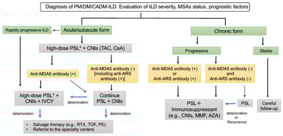 Proposal of a treatment algorithm for patients with PM-/DM-/CADM-ILD. * Methylprednisolone pulse therapy (1000 mg/day intravenous for 3 days) should be considered for severe ILD. PM—polymyositis; DM—dermatomyositis; CADM—clinically amyopathic DM; ILD—interstitial lung diseases; MSAs—myositis-specific autoantibodies; PSL—prednisolone; CNIs—calcineurin inhibitors; TAC—tacrolimus; CsA—cyclosporin A; MDA5—melanoma differentiation-associated gene 5; ARS—aminoacyl tRNA synthetase; IVCY—intravenous cyclophosphamide; MMF—mycophenolate mofetil; AZA—azathioprine; RTX—rituximab; TOF—tofacitinib; PE—plasma exchange.
