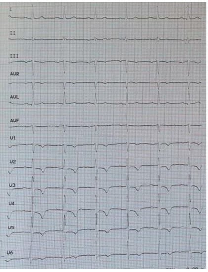 12 lead electrocardiogram (ECG) showing T wave inversion in leads III and V1–V6.
