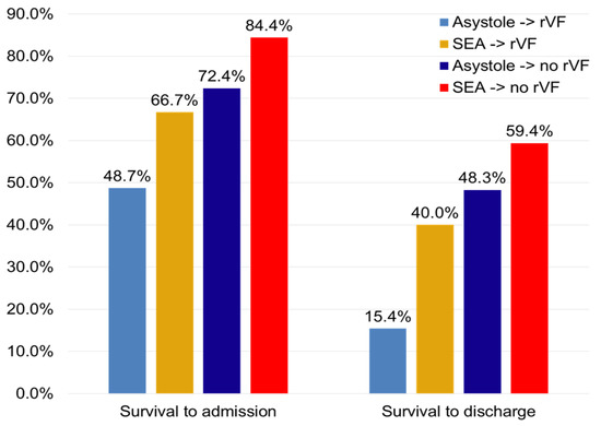 Short-term survival according to post-shock rhythm and rVF. rVF: recurrent VF; SEA: spontaneous electrical activity.