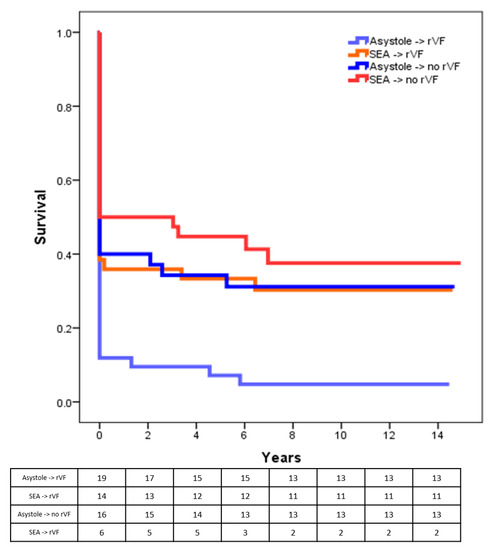 The 163 patients were divided into four groups, according to the post-shock rhythm and the incidence of VF recurrence. Mean time to first EMS team arrival was similar between patients with and without VF recurrence (5.8 ± 3.2 vs. 6.0 ± 3.9 min; p = 0.772). Overall, asystole was the post-shock rhythm in 82 patients (50.3%), of which 46 (28.2%) experienced at least one recurrence. The other 81 (49.7%) showed an SEA, which later degenerated into another VF in 43 patients (23.3%). Short-term and long-term survival for each group is shown in Figure 3 and Figure 4, respectively.