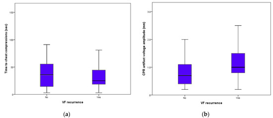 Overall, chest compressions were performed 241 total times after a VF was successfully terminated by a shock. Median time from shock to chest compression start was 19 s (1st–3rd quartile range 6 to 41 s) and the median voltage of the CPR artifact was 1.0 mV (1st–3rd quartile range 0.6 to 1.5 mV). Early chest compressions, defined as a CPR start within 19 s, was associated with a higher incidence of rVF (66.7% vs. 43.5%; p < 0.001). Vigorous chest compressions, defined as a CPR artifact ≥ 1 mV, was also associated with a higher VF recurrence incidence (79.2% vs. 42.7%; p < 0.001). Figure 5 shows the scatter boxes of time to chest compression start and CPR artifact voltage according to presence or absence of VF recurrence. Post-shock CPR was performed in 56 (87.5%) patients surviving hospital discharge with no neurological impairment and in 89 (89.8%) patients that either died or survived with neurological impairment (p = 0.63).