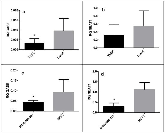 Relative quantity (RQ) of GAS5 (a) and NEAT1 (b) in the TNBC and Luminal A formalin-fixed paraffin-embedded (FFPE) samples and cell lines (c,d); * denotes p < 0.05.