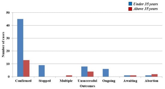 A total of 58 pregnancies were subsequently confirmed, more precisely 45 (36.88%) in women under 35 years and 13 (15.66%) in women above 35 years. Unfortunately, nine pregnancies (7.37%) from the group of women that were under 35 years of ceased to evolve, multiple pregnancies being however noted in one case of a 39-year-old woman with twins (1.20%). Moreover, twelve pregnancies (n = 8–6.55%) in females under 35 years of age, and n = 4–4.81%) in women above 35 years of age could not be carried out. Six ongoing pregnancies were registered at the time of writing (4.91%) in women under 35 years of age. In both groups there was a case where the result was expected, without any information regarding the status of the current pregnancy (n = 1–0.81%, and 1.20%–n = 1), respectively. Furthermore, there were also three situations in which mothers suffered an abortion (n = 1–0.81%) in women under 35 years of age, while (n = 2–2.40%) occurred within the group in which women were above 35 years of age. (Figure 1).